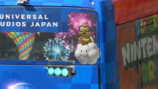 ユニバーサル・スタジオ・ジャパンの任天堂エリアが描かれたバスが走行中